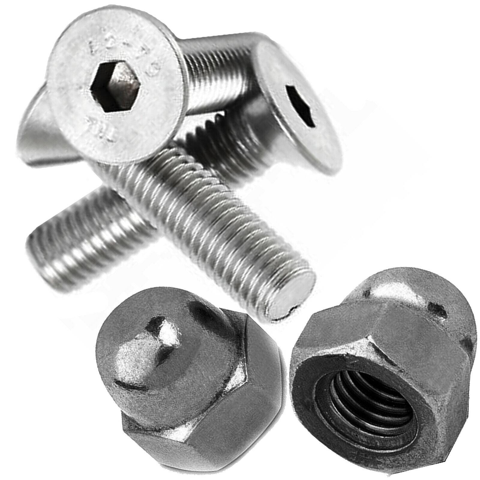 M10 A2 stainless steel countersunk socket bolts paired with hex dome cap nuts offer exceptional corrosion resistance and durability. Ideal for precision engineering and industrial applications, these fasteners provide a secure, flush finish with a sleek domed nut design, ensuring both strength and aesthetic appeal in demanding environments.